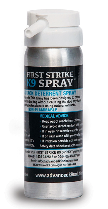 The handy 50ml First Strike K9 Spray Canister is a professional-grade deterrent spray designed to protect both you and your dog during encounters with aggressive canines. Perfect for dog owners wishing to have added peace of mind during their daily dog walking routines. The effects naturally dissipate within 10-20 minutes, ensuring no permanent impact on the animal.